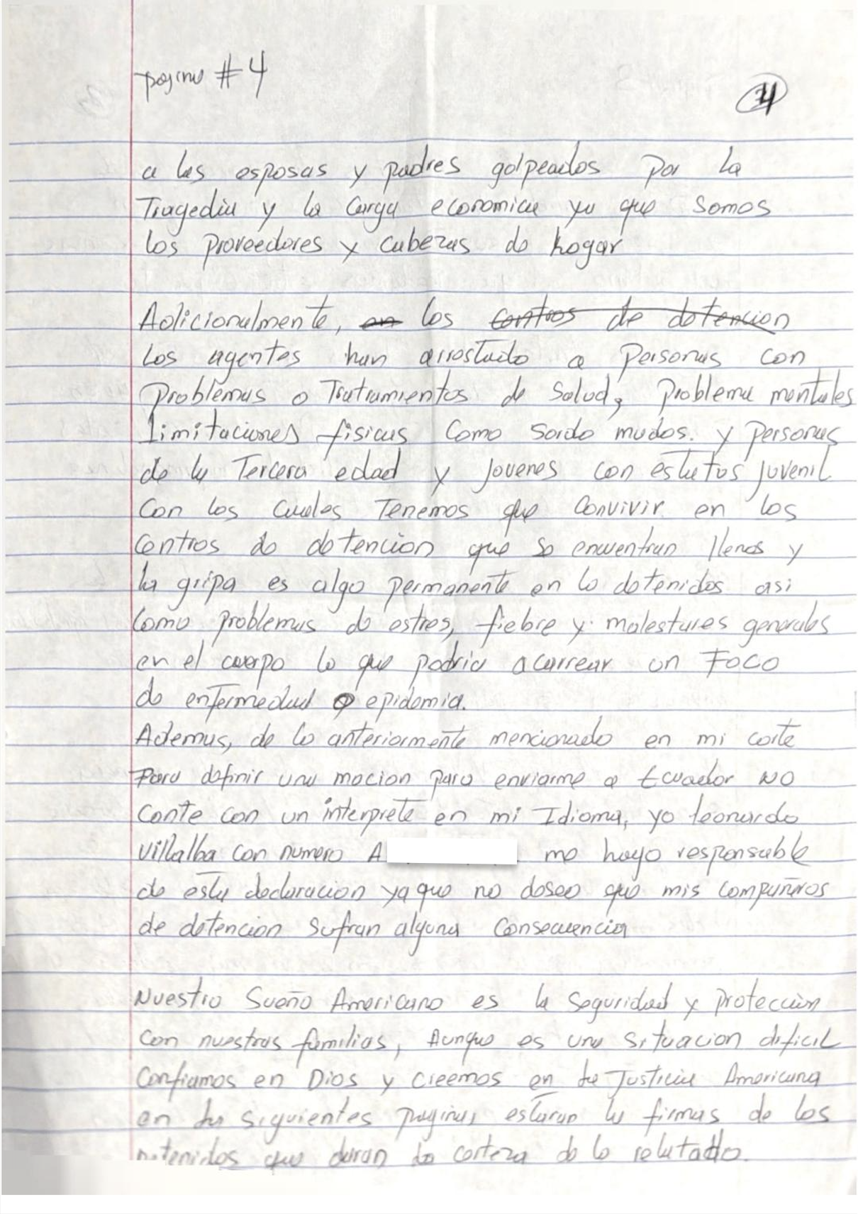 In addition to what was previously mentioned in my court hearing with the motion to send me to Ecuador, I did not have an interpreter in my language. I, Leonardo Villalba, with identification number A■■■■■■■■■, take responsibility for this statement, as I do not want my fellow detainees to suffer any consequences. Our American dream is safety and protection - with our families. Although this is a difficult situation, we trust in God and believe in American justice. On the following pages are the signatures of the detainees who will corroborate what has been stated.